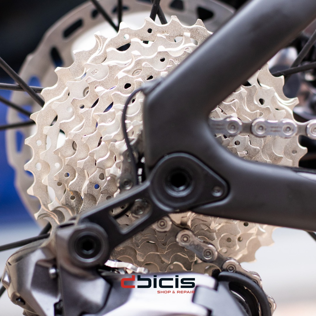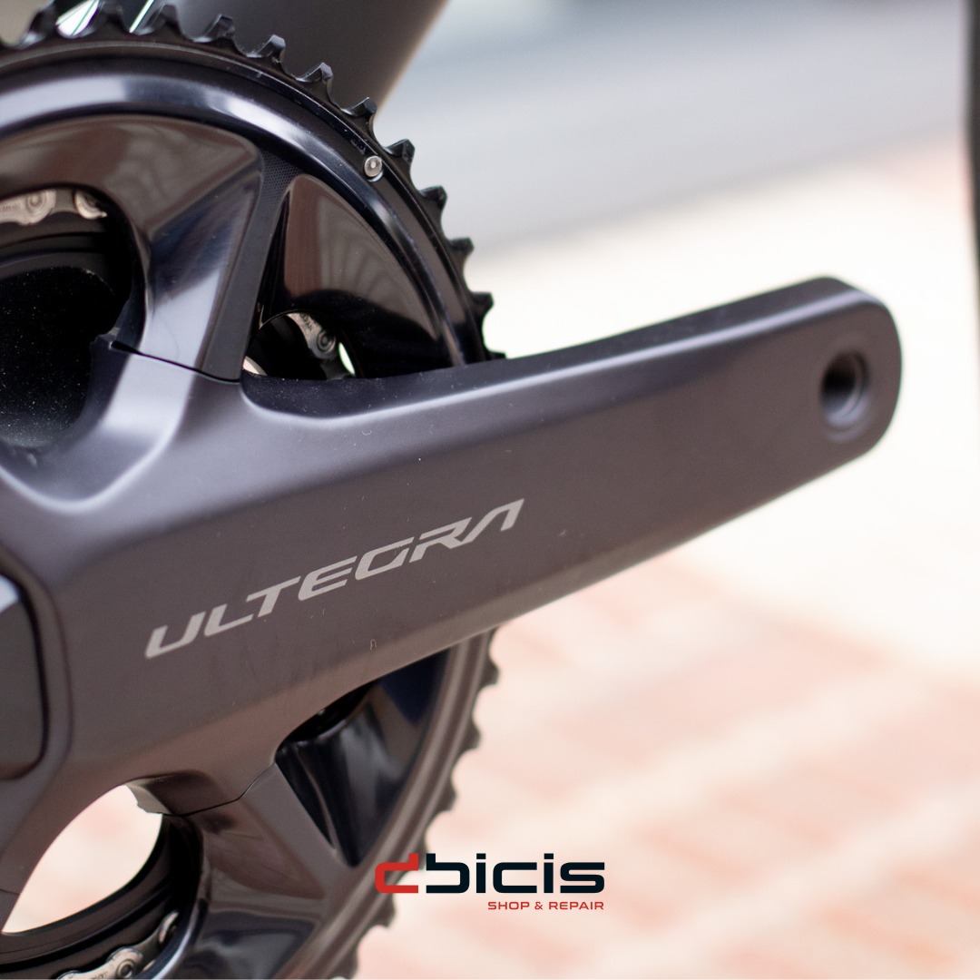 Además, puedes personalizarla a tu gusto, como se muestra en la imagen con un Grupo completo Ultegra Di2 12V con mandos satélite y bielas Ultegra con potenciómetro.